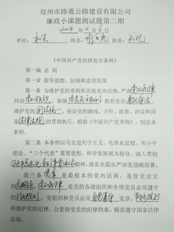 近日,鄭州市路通公司黨委在公司周例會的廉政小課堂上“正式推出”一項新舉措——廉政知識專項測試。測試內(nèi)容涉及中央八項規(guī)定精神和省市相關(guān)規(guī)定,聚焦各類黨紀政紀條例法規(guī)?荚嚥扇¢]卷的形式,對與會的公司領(lǐng)導、中層干部、直屬單位的領(lǐng)導班子進行一次嚴格的黨風廉政教育。試卷由公司紀委統(tǒng)一評分,并進行公示,成績在80分以下人員必須補考。