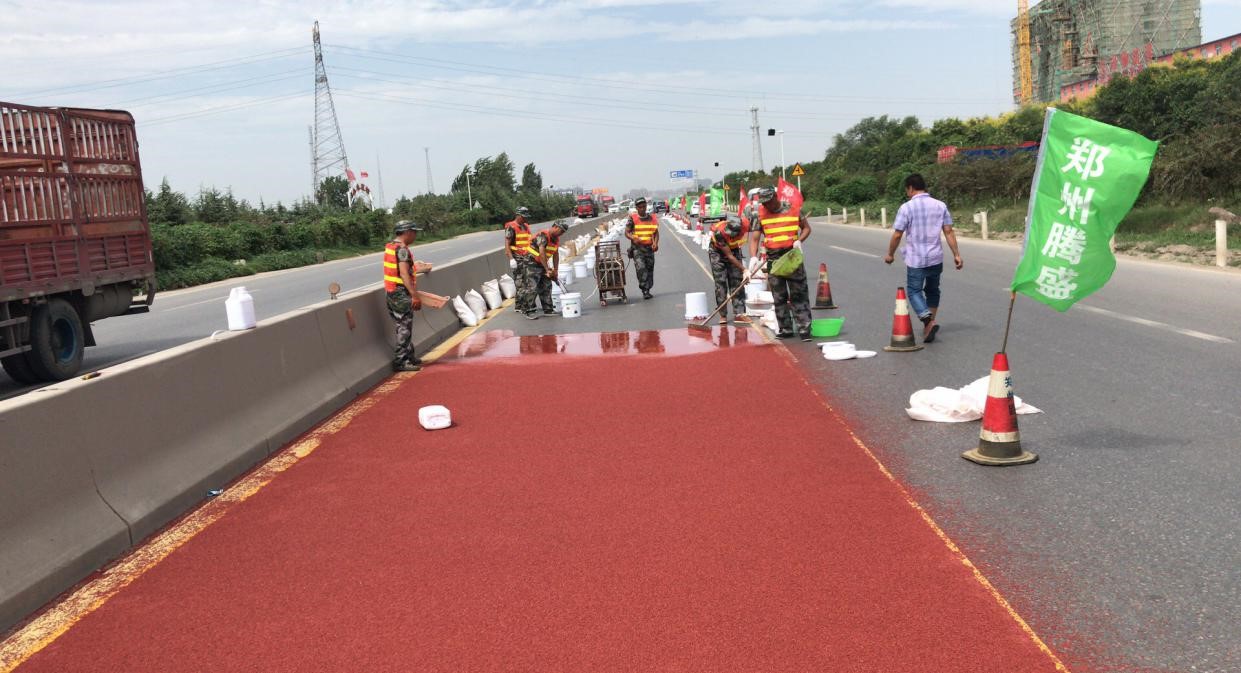 為改善鄭州市國省干線道路單一化、老舊化現(xiàn)象,推進(jìn)我市道路多元化、多彩化發(fā)展,使公路成為城市多姿多彩的一道風(fēng)景線,鄭州市公路管理局在G107京深線安防工程中計劃中實施彩色路面設(shè)計。我公司作為中標(biāo)單位承接了該項目的實施工作。經(jīng)過多方調(diào)研考察,在經(jīng)過充分的前期準(zhǔn)備工作后,于日前啟動了G107國道彩色防滑路面工程。