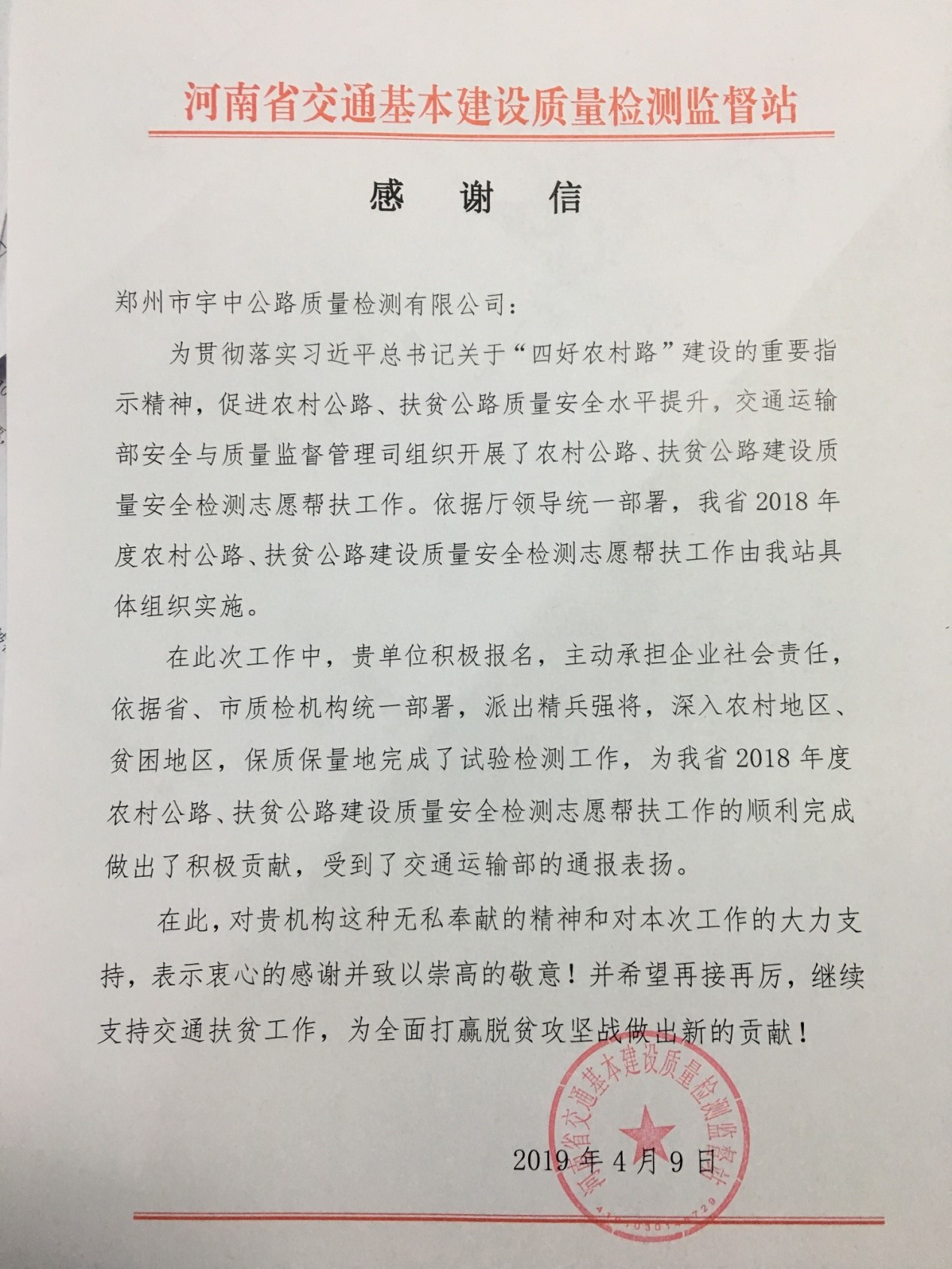 4月22日,質(zhì)檢中心收到了一封來自河南省交通基本建設(shè)質(zhì)量檢測監(jiān)督站的感謝信,感謝質(zhì)檢中心在促進(jìn)農(nóng)村公路、扶貧公路質(zhì)量安全水平提升等方面做出的積極貢獻(xiàn)。