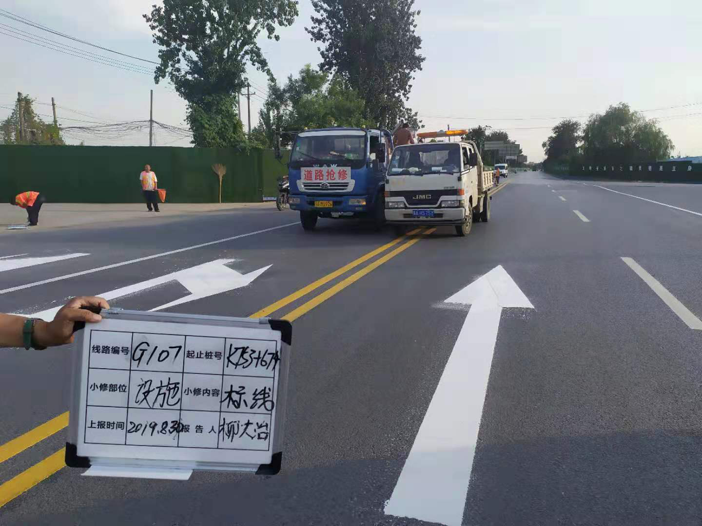 為進(jìn)一步加快公路基礎(chǔ)設(shè)施建設(shè),保障公路通行安全質(zhì)量,提升城市對(duì)外形象,我公司近期組織力量重點(diǎn)對(duì)所轄公路路面的標(biāo)識(shí)標(biāo)線進(jìn)行完善,對(duì)破損、磨損、不清晰的交通標(biāo)線重新規(guī)劃,對(duì)需新增交通標(biāo)志、標(biāo)線的路段進(jìn)行新增,確保所轄公路交通標(biāo)識(shí)標(biāo)線標(biāo)準(zhǔn)化、科學(xué)化,達(dá)到標(biāo)識(shí)標(biāo)線清晰、標(biāo)志明顯、行車規(guī)范、文明駕駛的目的。此次路面標(biāo)志標(biāo)線共計(jì)完成4.45萬(wàn)米。