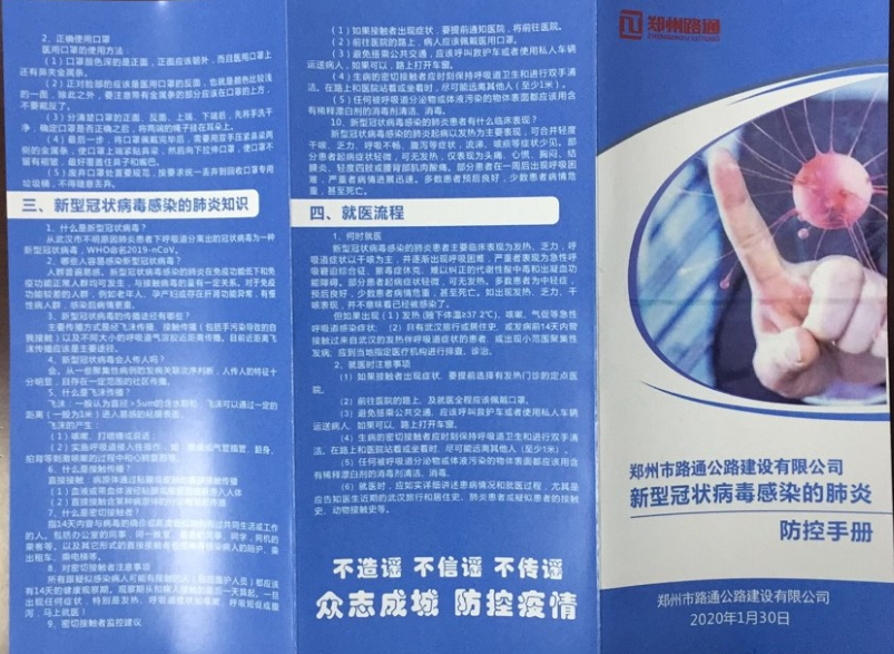 廣泛動員群防群治。制定《路通防控新型冠狀病毒感染肺炎知識手冊》,結(jié)合單位職工工作生活特點,就工作區(qū)域防護、個人防護、居家防護、就醫(yī)注意事項等四個方面進行整理歸納,確保職工能夠在工作和生活中正確保護自己和他人。并對新型冠狀病毒感染肺炎相關(guān)知識點進行科普,對常見的9個問題進行科學(xué)解答,讓全體職工了解事實講依據(jù),不信謠、不傳謠。在公司的官方網(wǎng)站、微信公眾號等平臺持續(xù)推送相關(guān)報道,對中央關(guān)于“疫情防控”決策部署、疫情防控知識、疫情防控工作動態(tài)等進行深入廣泛的宣傳,積極進行正面的輿論引導(dǎo)。截止到目前,共推送轉(zhuǎn)發(fā)相關(guān)預(yù)防信息40余條。